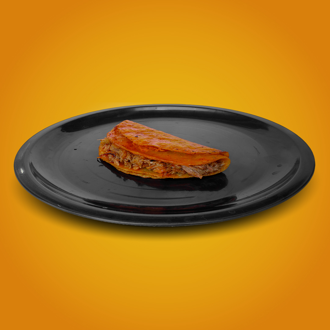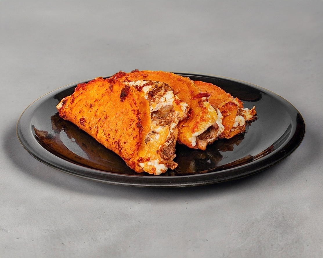 Tortilla doradita de maíz, rellena de carne jugosa y queso derretido., el antojo clásico que no falla.