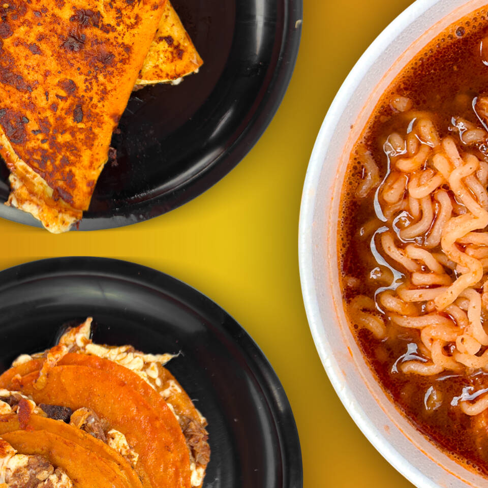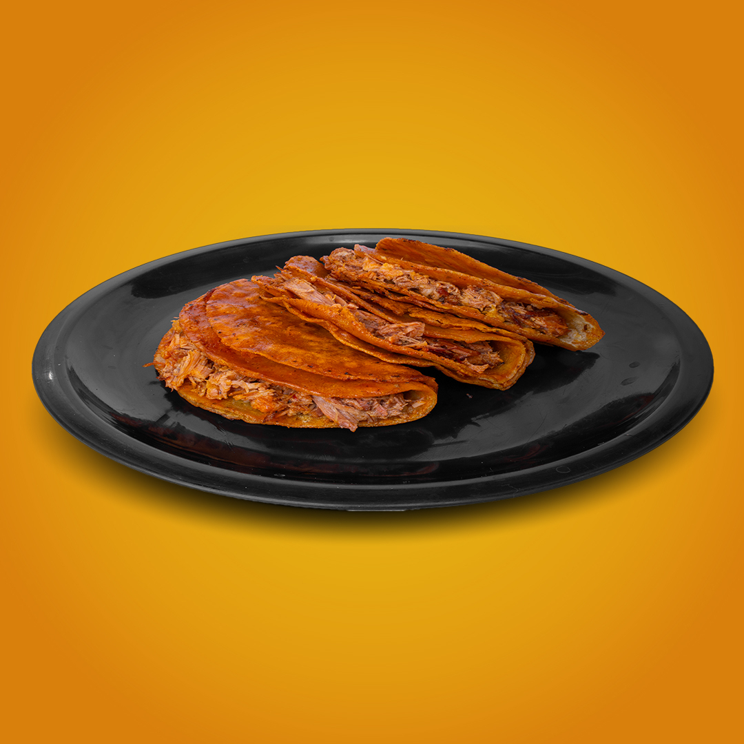 2 Quesabirrias crujientes de maíz, más 1 birria con carne, Pa’ los que vienen con hambre y sin miedo.