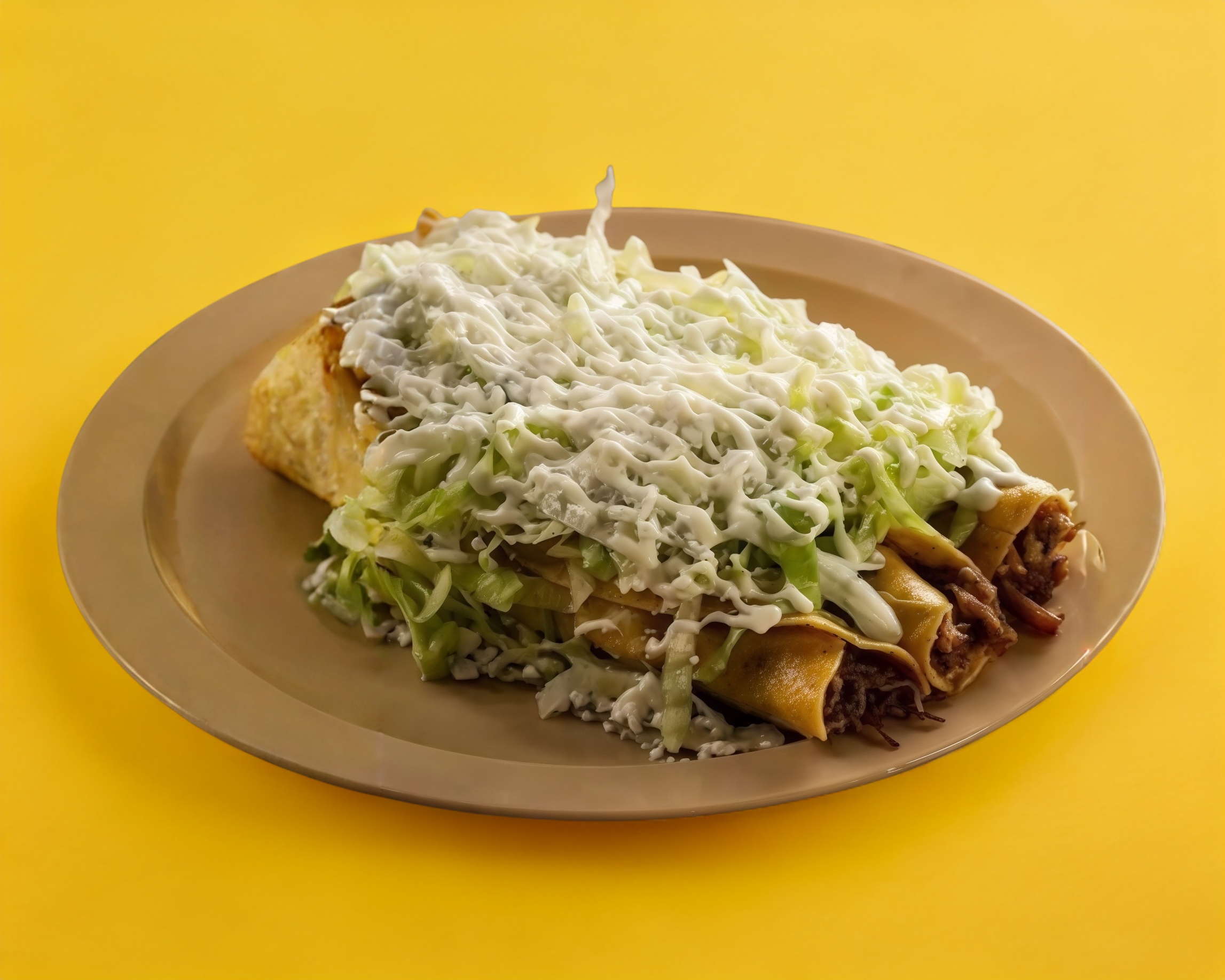 Taco dorado con guisado a elegir, acompañadas de lechuga, queso, crema.