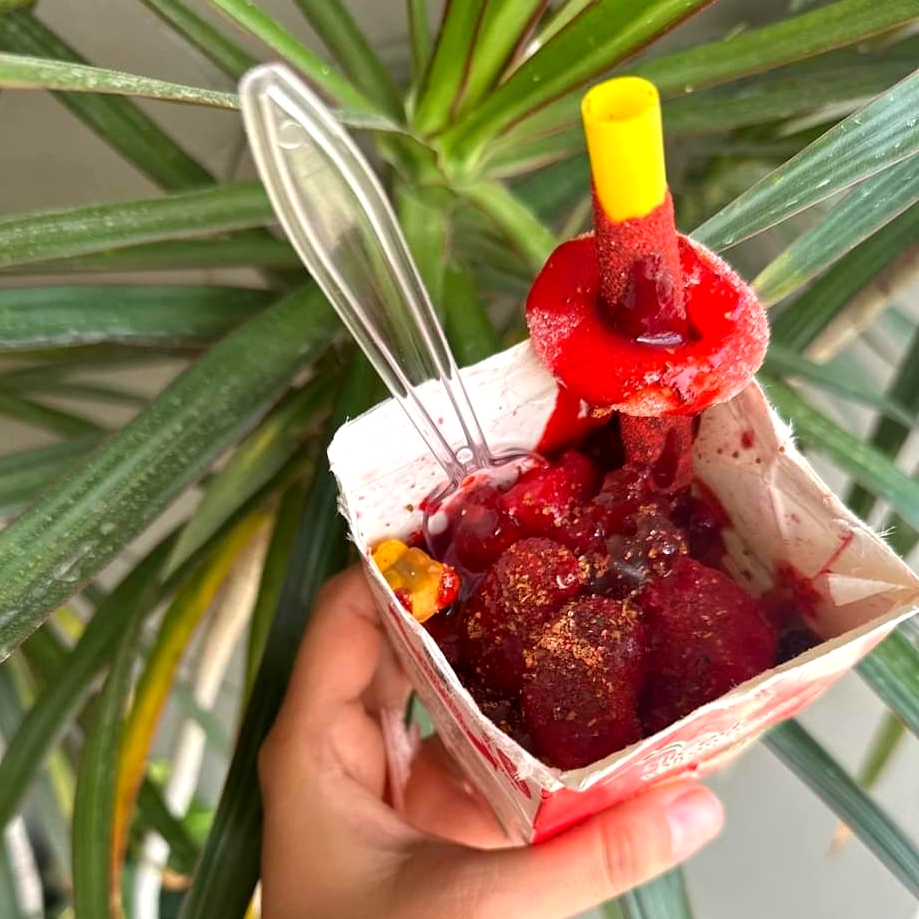Cajita de fresas congeladas, preparadas con chamoy, Miguelito, 1 popote de tamarindo y gomitas.