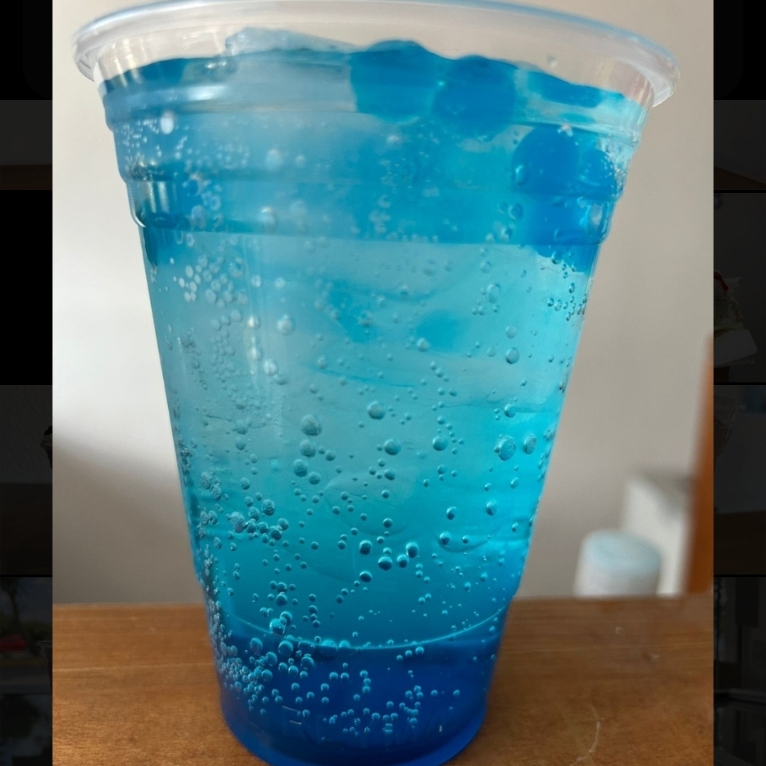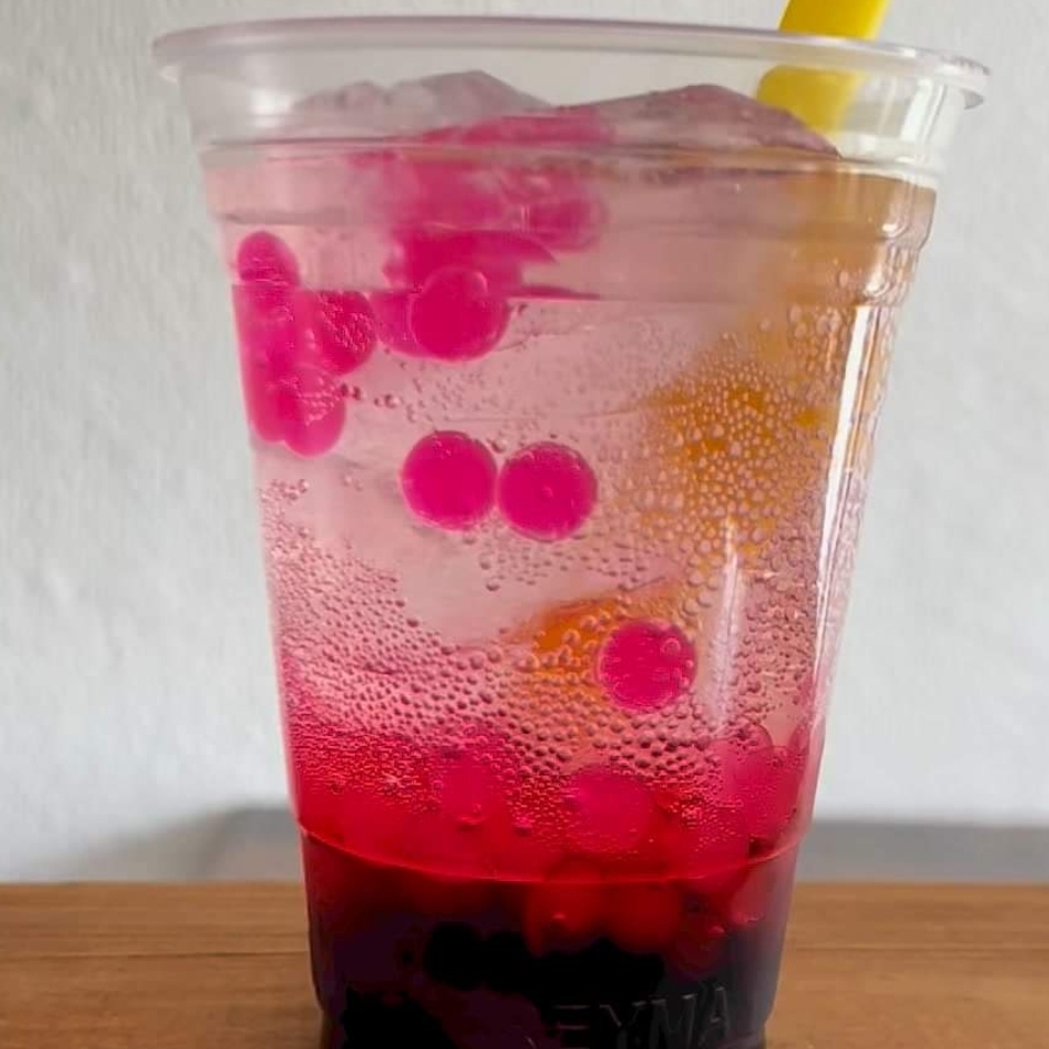 Vaso del 16, Bebida con hielos hecha de agua carbonatada y jarabe saborizado de Frutos Rojos con perlas explosivas a tu elección.