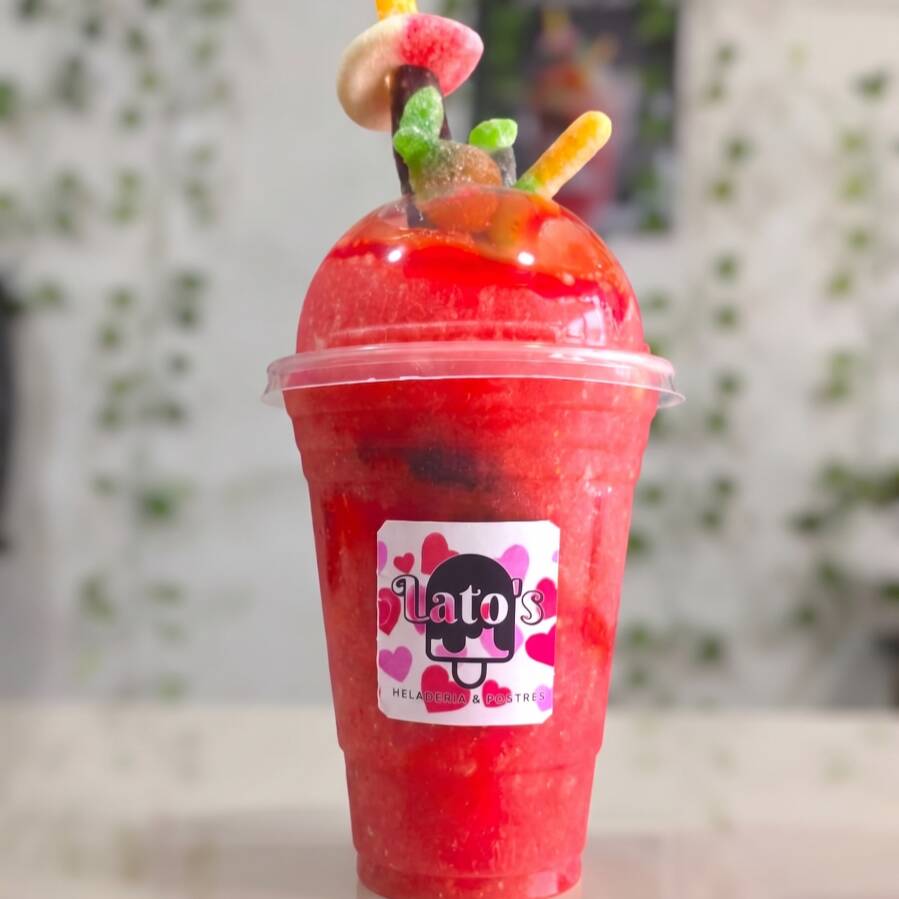 Granizado de FRESA natural tipo frappe base agua, con chamoy, gomitas y una banderilla de tamarindo
