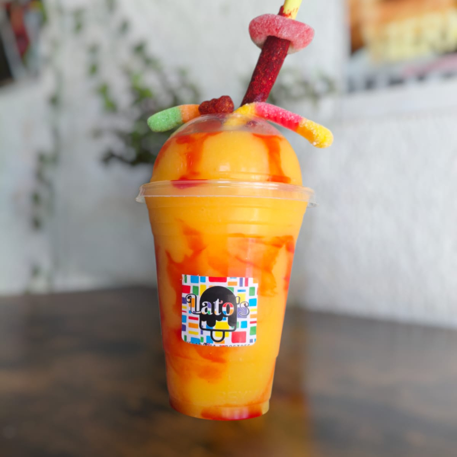 Granizado de mango natural tipo frappe base agua, con chamoy, gomitas y una banderilla de tamarindo