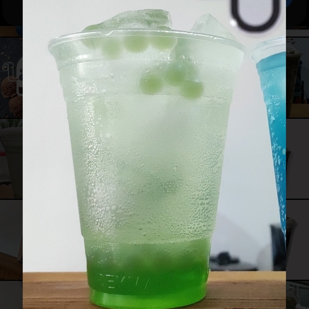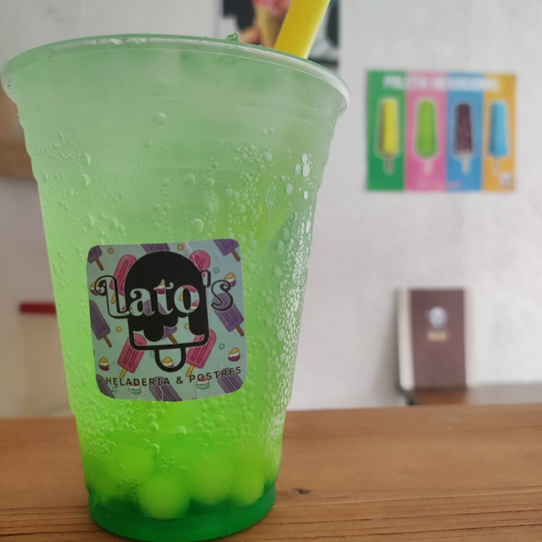 Vaso del 16, Bebida con hielos hecha de agua carbonatada y jarabe saborizado de KIWI con perlas explosivas a tu elección.