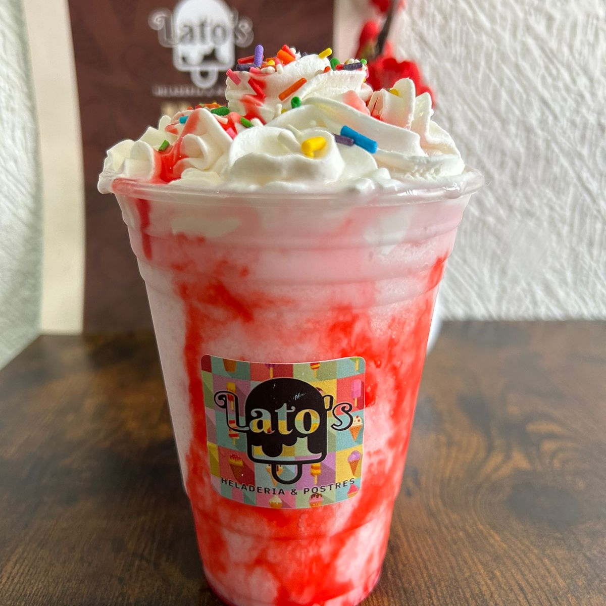 Bebida de 435 ml a base de hielo triturado, leche de tu elección, sabor fresa con chantilly, jarabe de fresa hershey´s y sprinkles de colores.