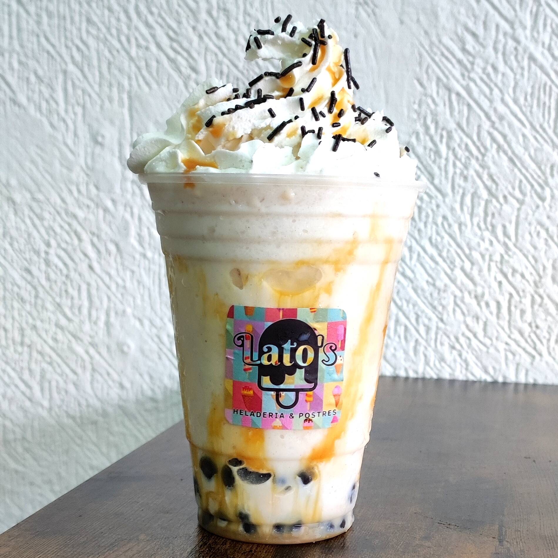 Bebida de 435 ml a base de hielo triturado, leche de tu elección, sabor caramelo con chantilly, jarabe de caramelo y sprinkles de chocolate.