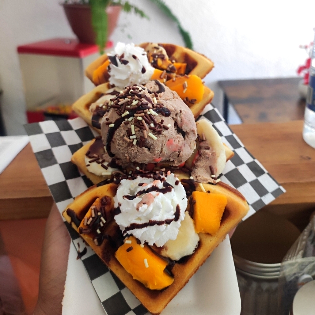 1 waffle de 4 pzs, 2 untables, 2 toppings, 1 bola de helado y chantilly, granillo.