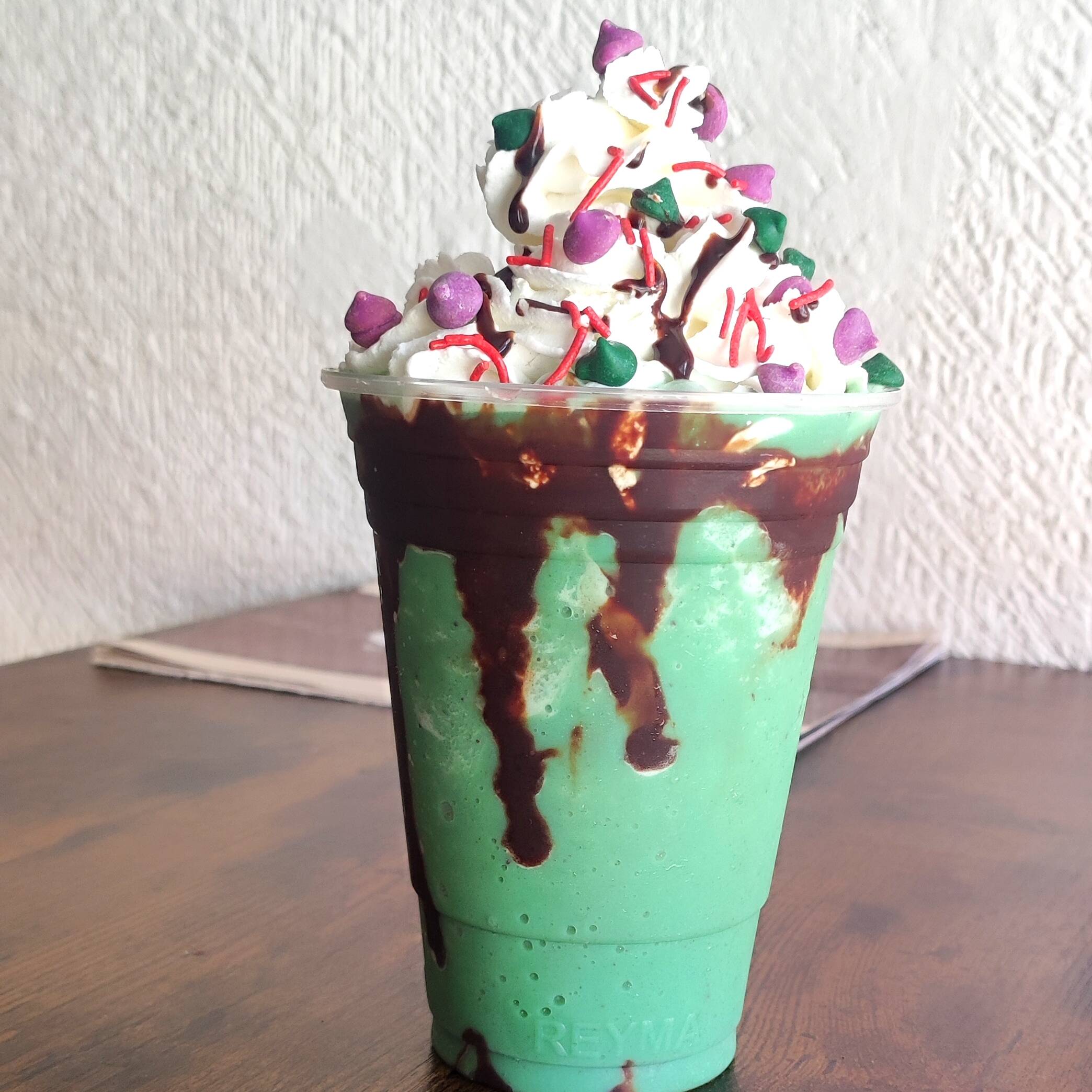 Bebida de 435 ml a base de hielo triturado, leche de tu elección, sabor té matcha con chantilly, jarabe de chocolate hershey´s y sprinkles de chocolate.