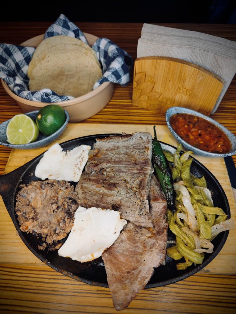 Servida del sartén caliente, acompañada de frijoles, queso, nopales y cebolla asada. Incluye tortillas, salsa y limones.