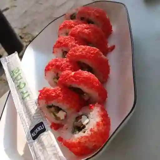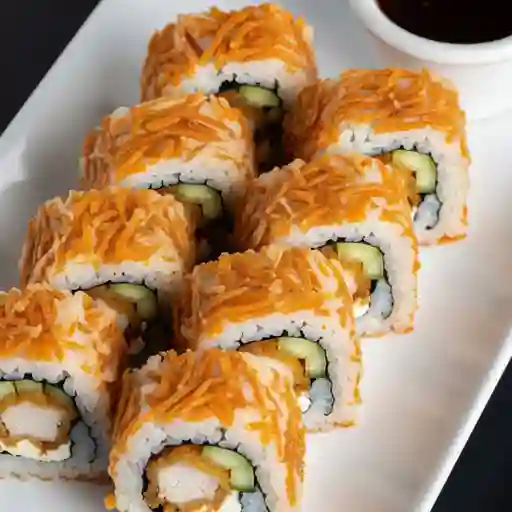 Pollo teriyaki, aguacate, philadelphia y zanahoria, fuera empanizado con cheetos flamin' hot.