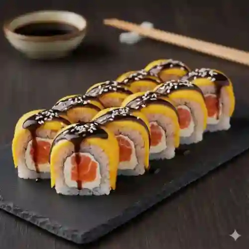 Dentro alga, salmón, philadelphia y zanahoria, fuera mango, salsa teriyaki y ajonjolí.