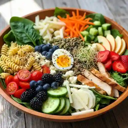 Pasta, lechuga, espinaca, manzana, fresa, blueberry, zarzamora, pepino, jícama, zanahoria, germen, cherry, semillas, pollo y huevo.