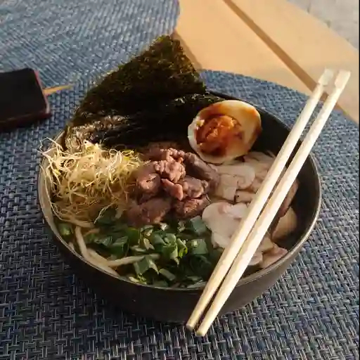 Fideos noodles, champiñones, cebollín, huevo y alga nori.