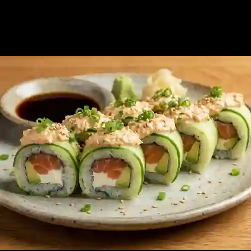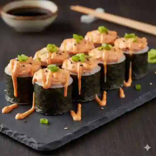 Dentro alga, atún picante, philadelphia y pepino, fuera alga y salsa mayonesa picante.