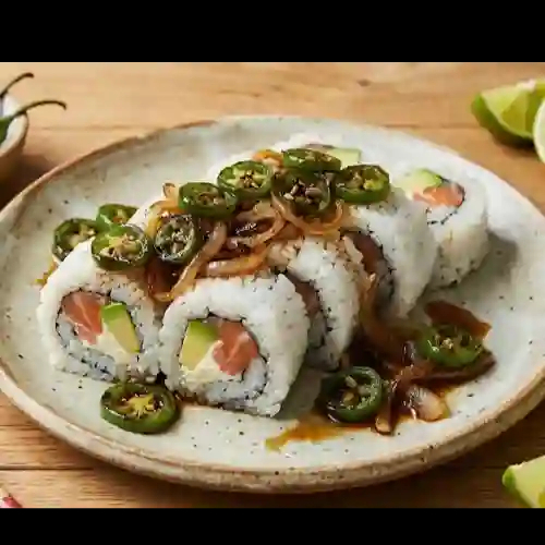 Queso philadelphia, zanahoria, aguacate y tampico, por fuera ajonjolí variado y chiles toreados. (10 pzas).