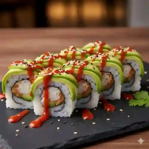 Dentro alga, philadelphia, pepino y pollo, fuera aguacate, salsa sriracha y ajonjolí tostado.