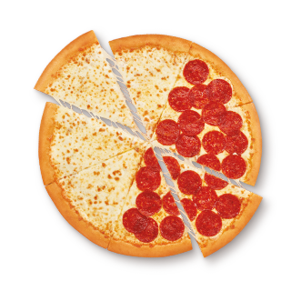 Pizza grande con 3 secciones diferentes: 4 rebanadas de pepperoni, 2 rebanadas de jamón con salchicha italiana y 2 rebanadas de extra queso.