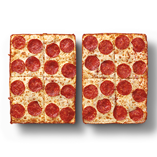 pizza cuadrada y grande de pepperoni con 8 rebanadas con la orilla de queso crujiente
