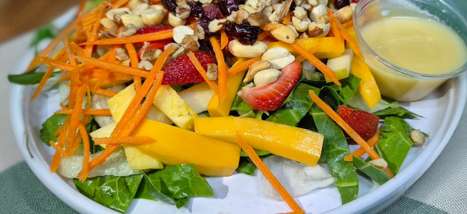 Con espinacas, lechuga, acelgas, zanahoria, manzana, (mango y fresa en temporada), piña, nuez, arándanos, cacahuate y aderezo agridulce.