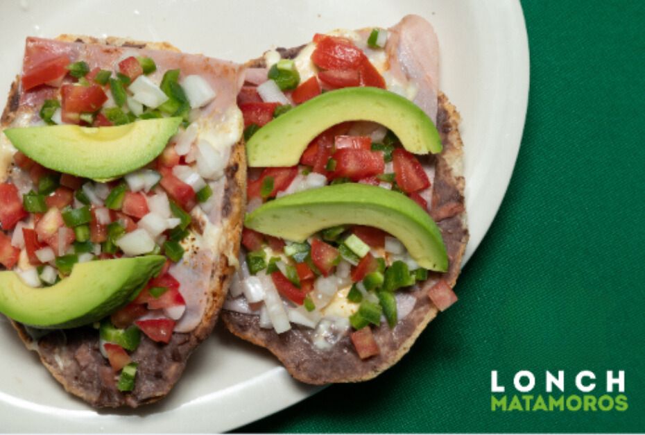 Pan con frijoles, jamón, queso Oaxaca, acompañado de pico de gallo y aguacate.