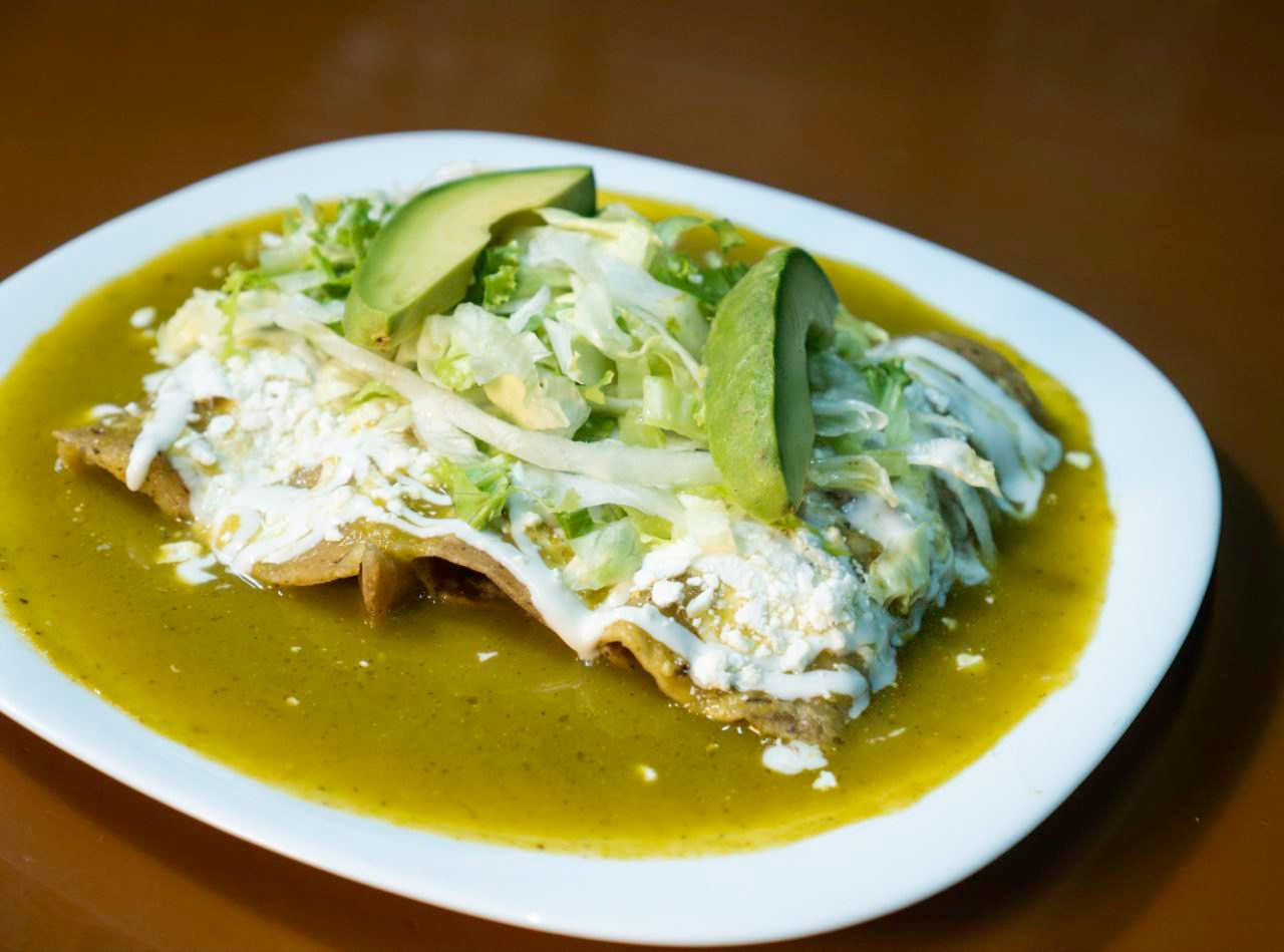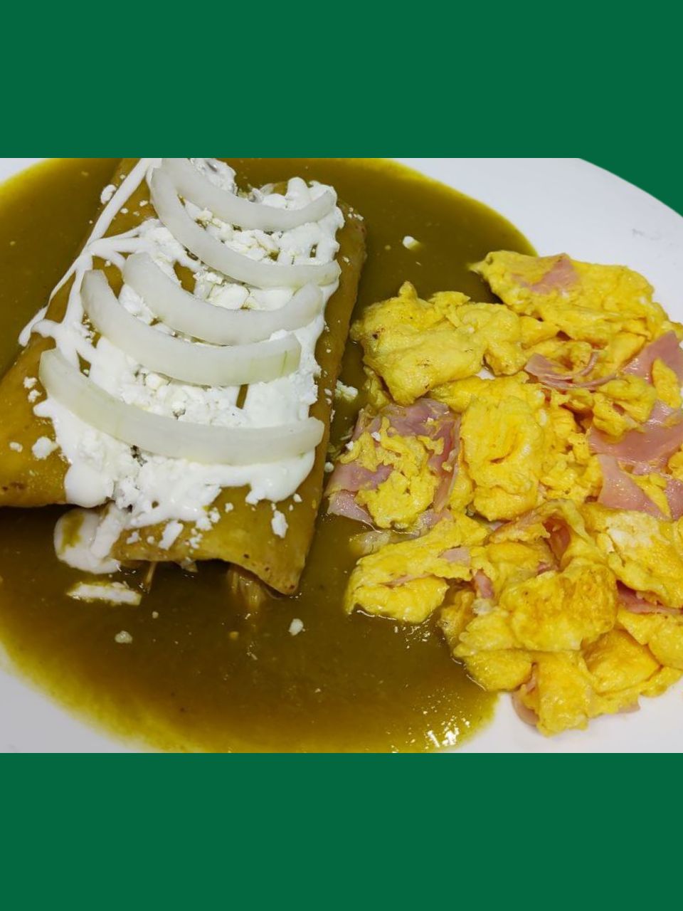 Dos enchiladas en salsa verde rellenas de queso panela o pollo deshebrado, preparadas con crema, queso rallado, acompañadas de huevo con jamón. (Incluye pan).