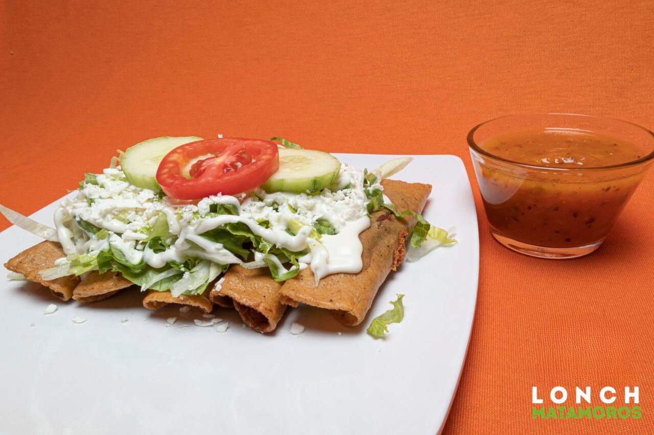 Rellenas de pollo deshebrado, queso Oaxaca, frijoles, crema, queso rallado y lechuga.