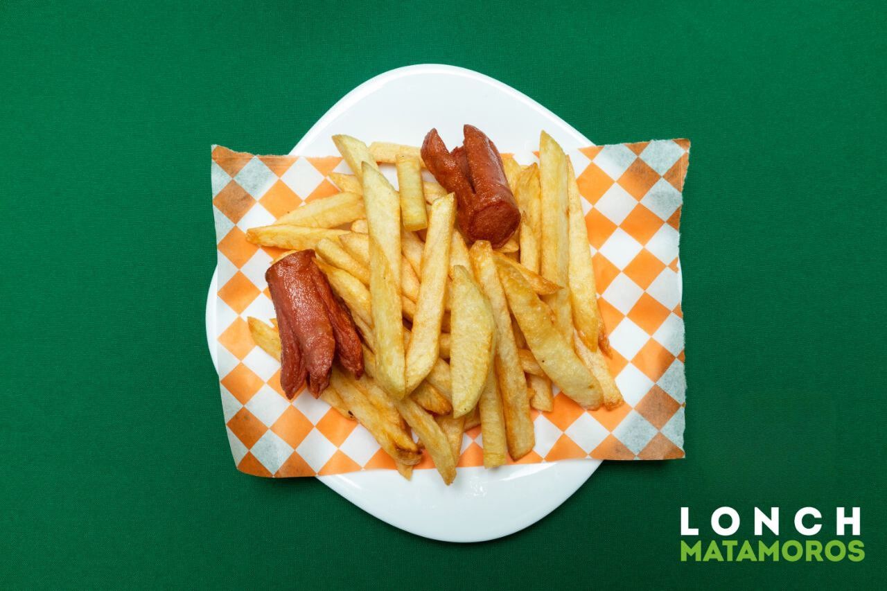 400 g De papas y salchicha frita, acompañadas de cátsup y salsa.