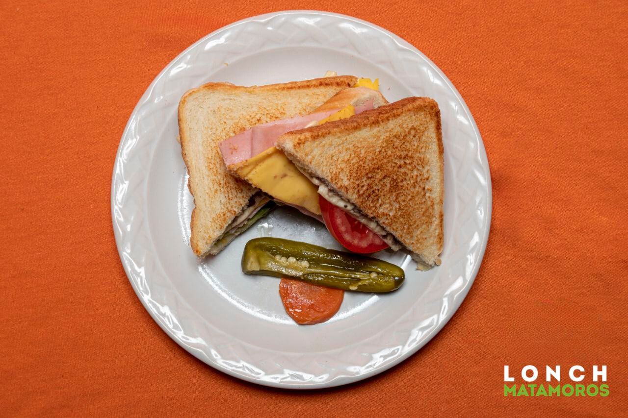 Con jamón, queso panela, queso Oaxaca, mayonesa, lechuga, rajas y jitomate; acompañado de 220 g de papas a la francesa o 45 g de papas (tipo Sabritas).