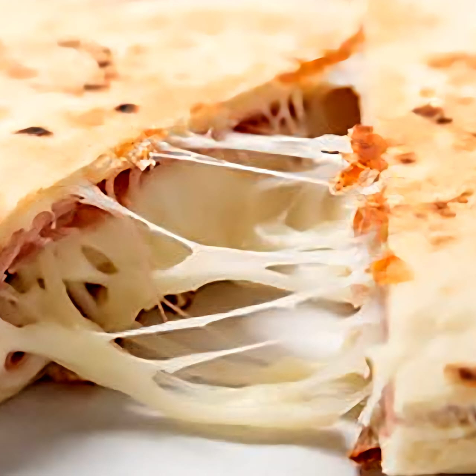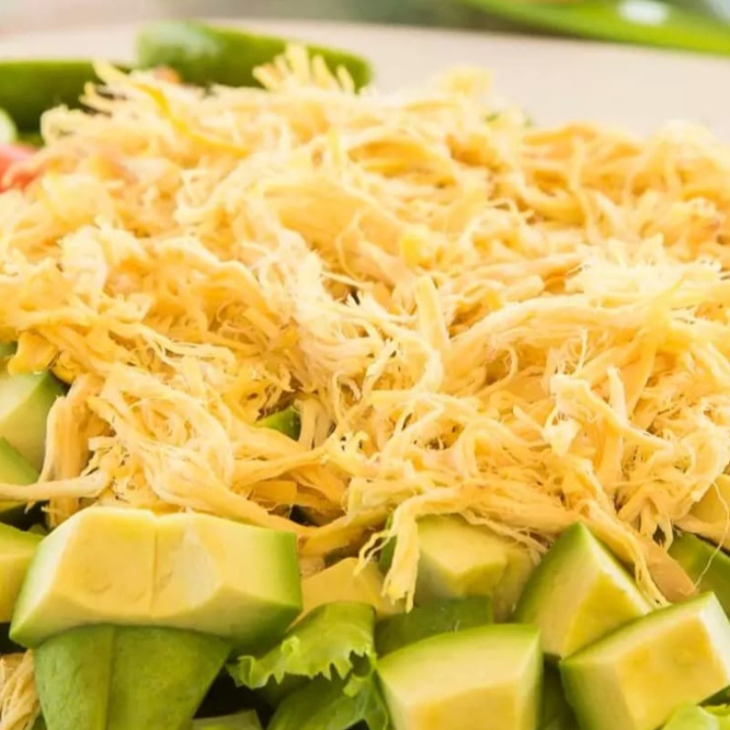 Pechuga jugosa y deshebrada, acompañada de queso fundido.