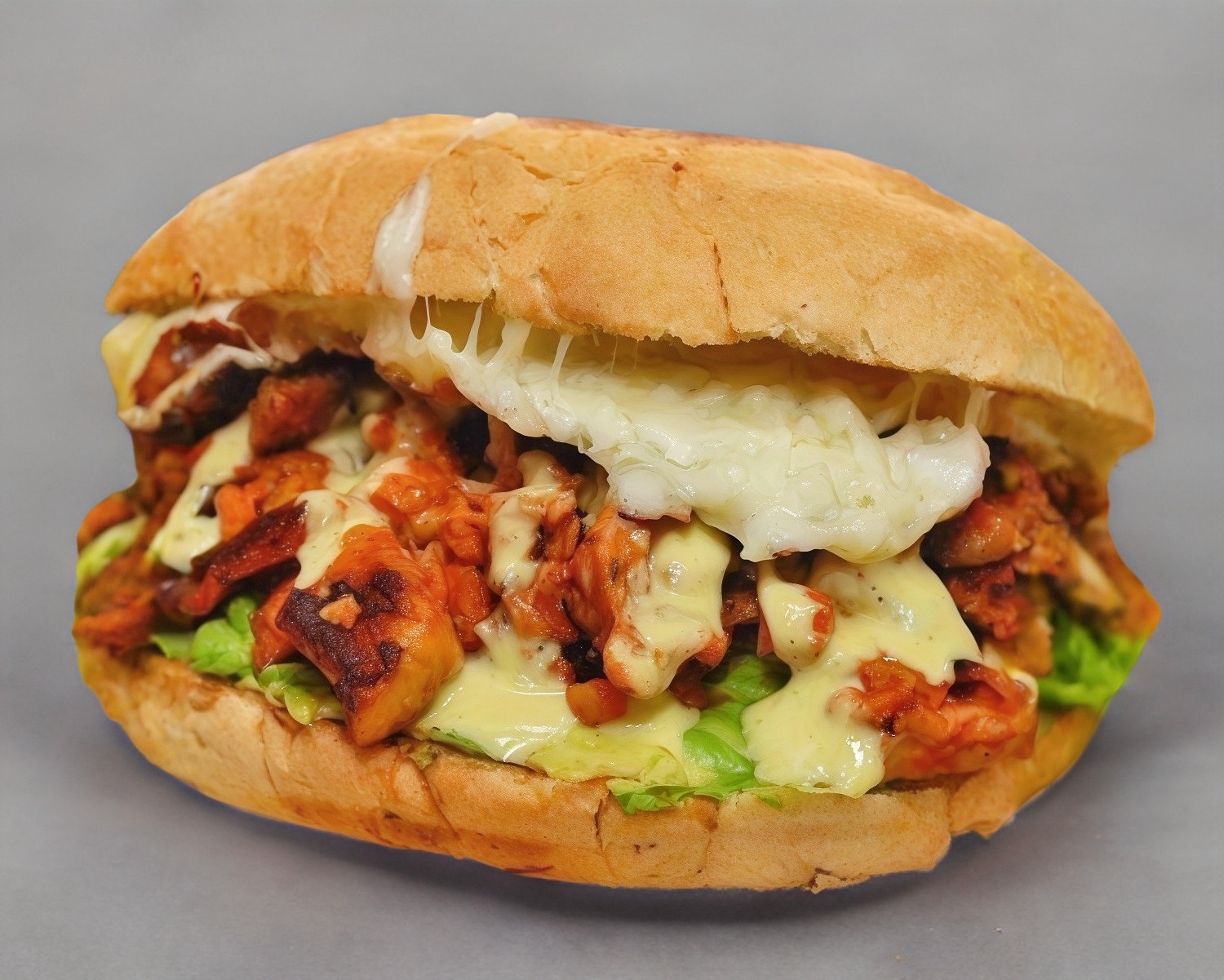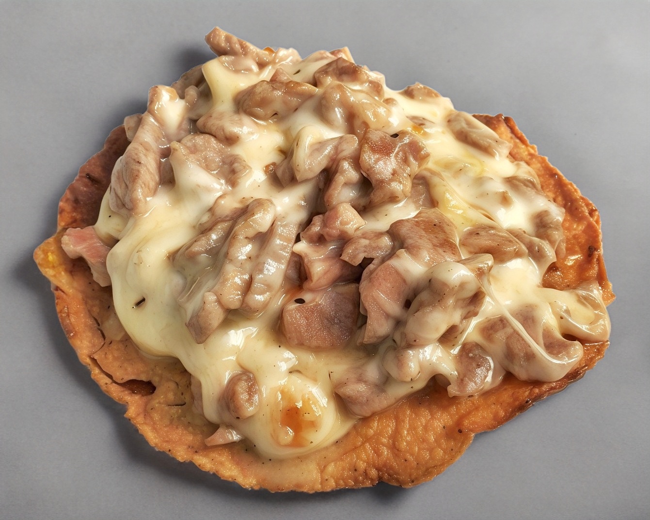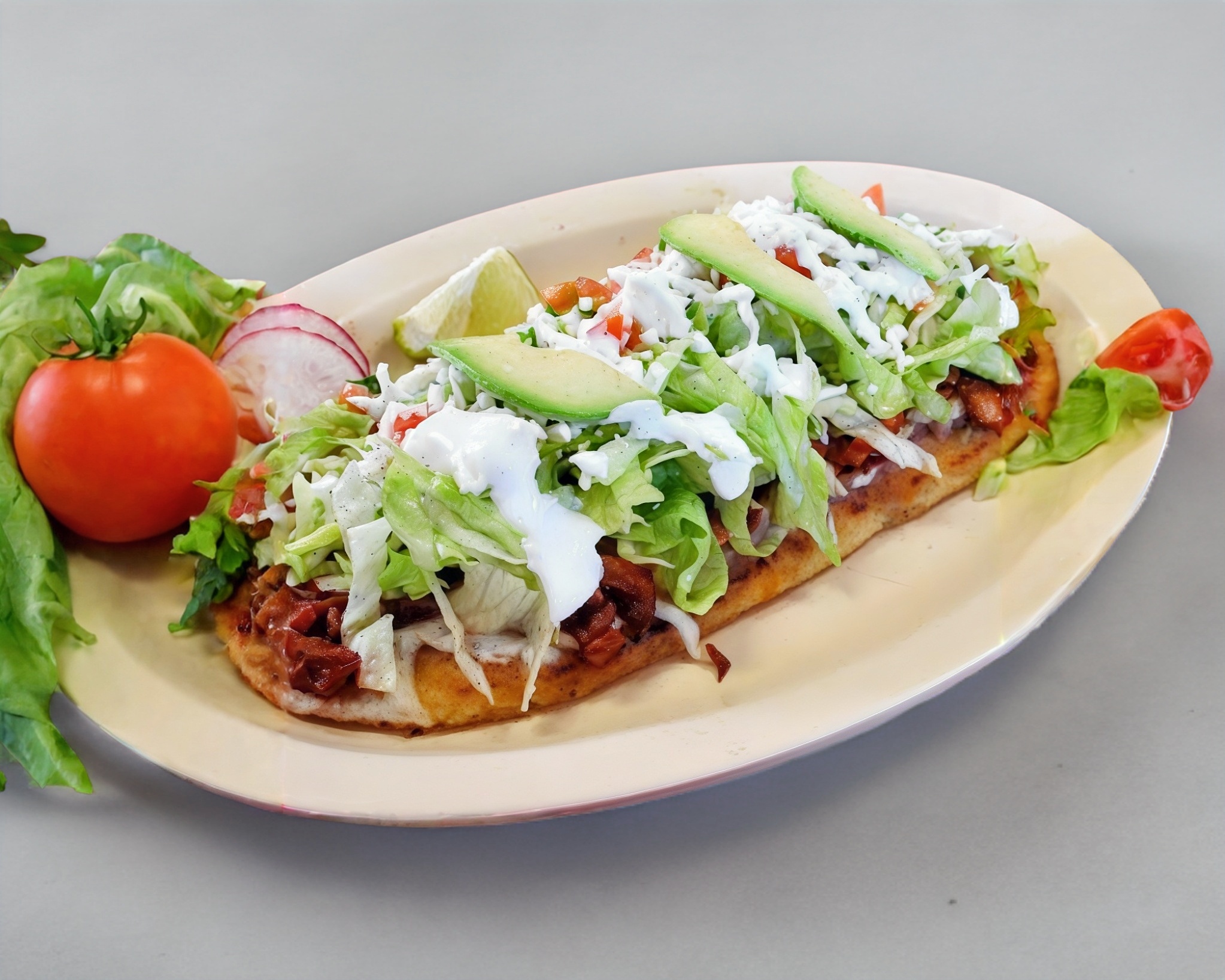 Huarache con proteína, queso, crema, frijoles, lechuga, aguacate y jitomate.