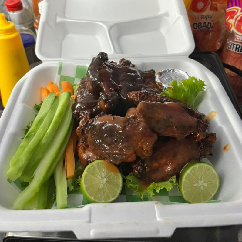 8 piezas de alitas acompañadas de lechuga, pepino, zanahoria, limon, aderezo ranch