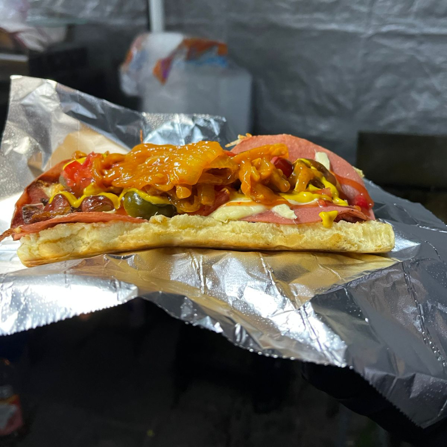 SALCHICHA JUMBO, TOCINO, JAMON, QUESO OAXACA, QUESO AMARILLO CEBOLLA CARAMELIZADA Y/O NORMAL, JITOMATE, CHILES, MOSTAZA, MAYONESA, CATSUP.