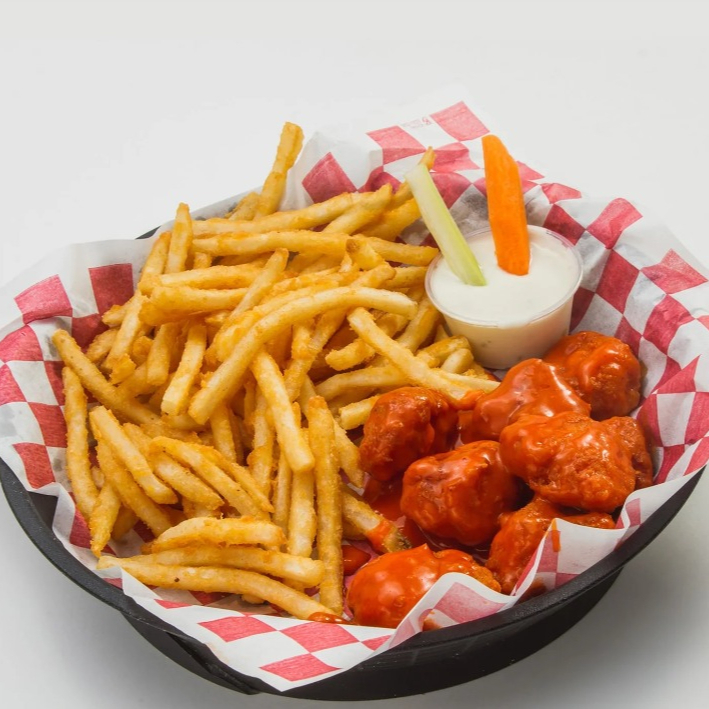6 piezas de boneless acompañados de lechuga, pepino, zanahoria, limon, y aderezo ranch.