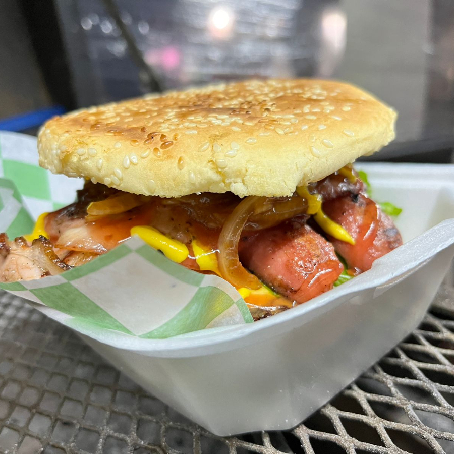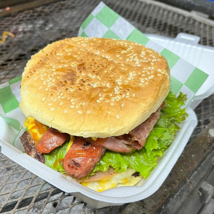 Doble carne, queso amarillo, jamon, salchicha, queso oaxaca, tocino, piña, lechuga, jitomate, cebolla, chiles, catsup, mostaza, mayonesa.