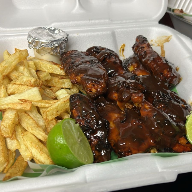 6 piezas de alitas con papas a la francesa, aderezo ranch y limon.