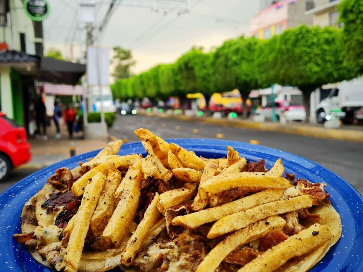 Taco Gigante con a la carne a elección con queso y tortilla echa a mano cebolla y papas fritas