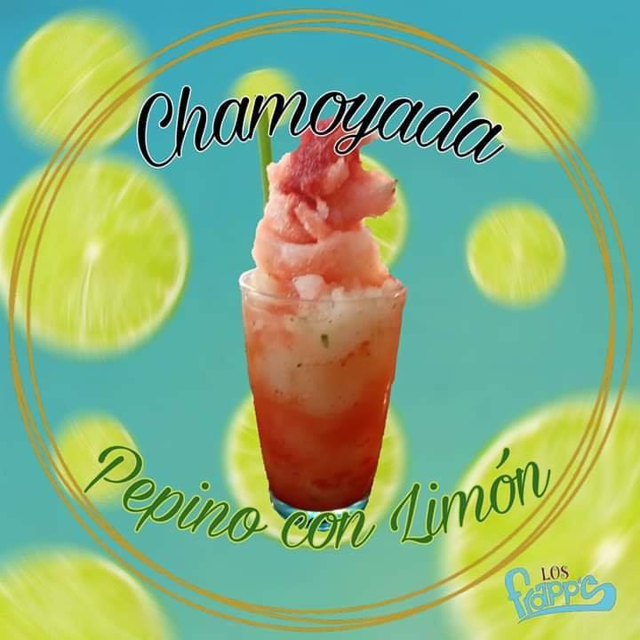 Deliciosa bebida helada preparada a base limón y pepino, bañada de rico chamoy casero y decorada con una mangomita