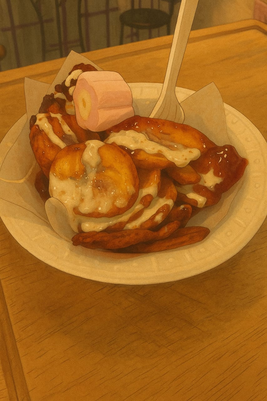 Deliciosos platanos fritos bañados con lechera, crema y mermelada de fresa. Servidos recién preparados y crujientes con un malvavisco para decorar.