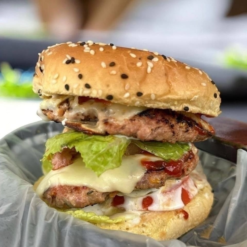 Hamburguesa con el doble de carne de res, pan mas grande, queso, lechuga, jitomate, pepinillos, catsup, jalapeño, mayonesa, mostaza., tocino y piña