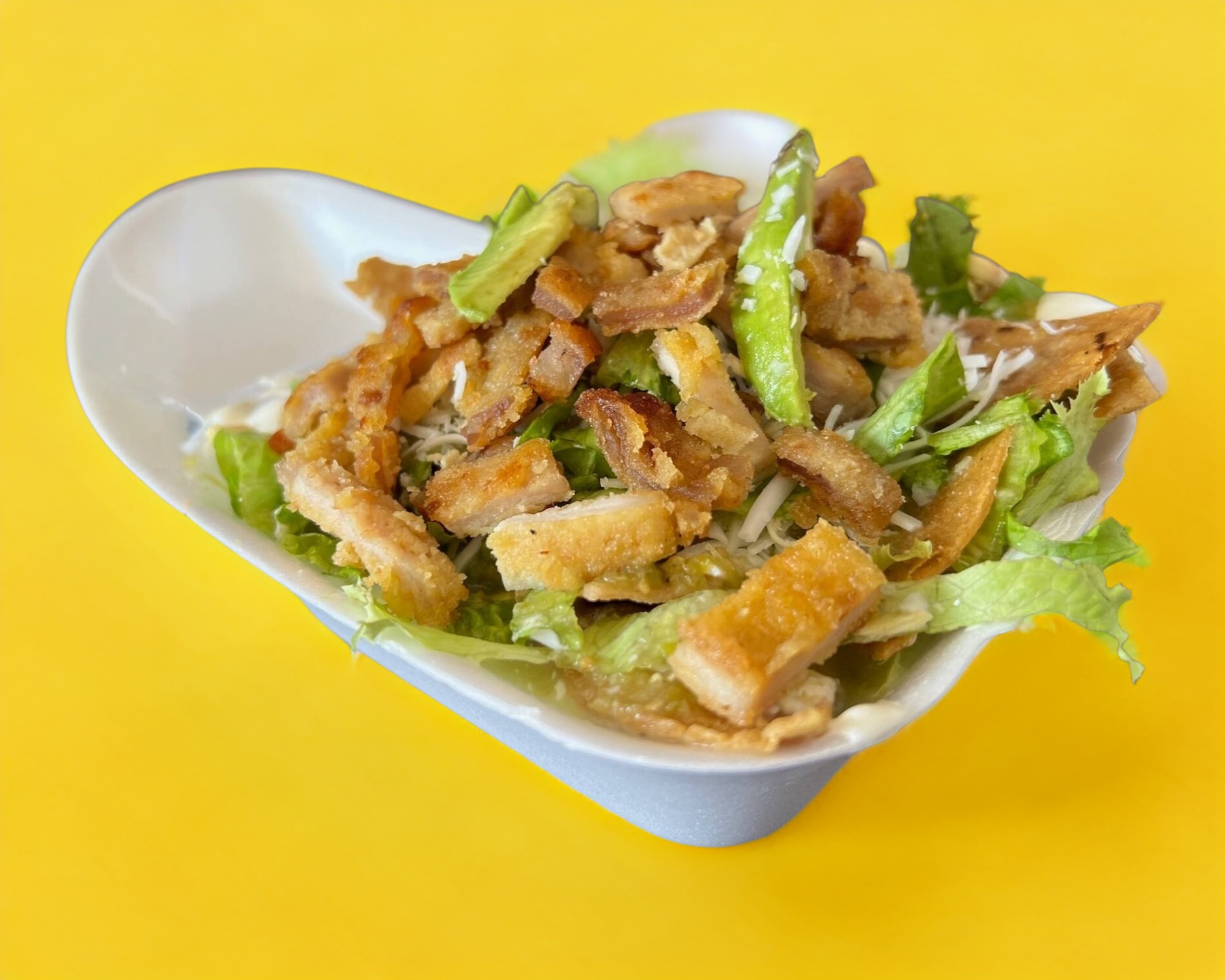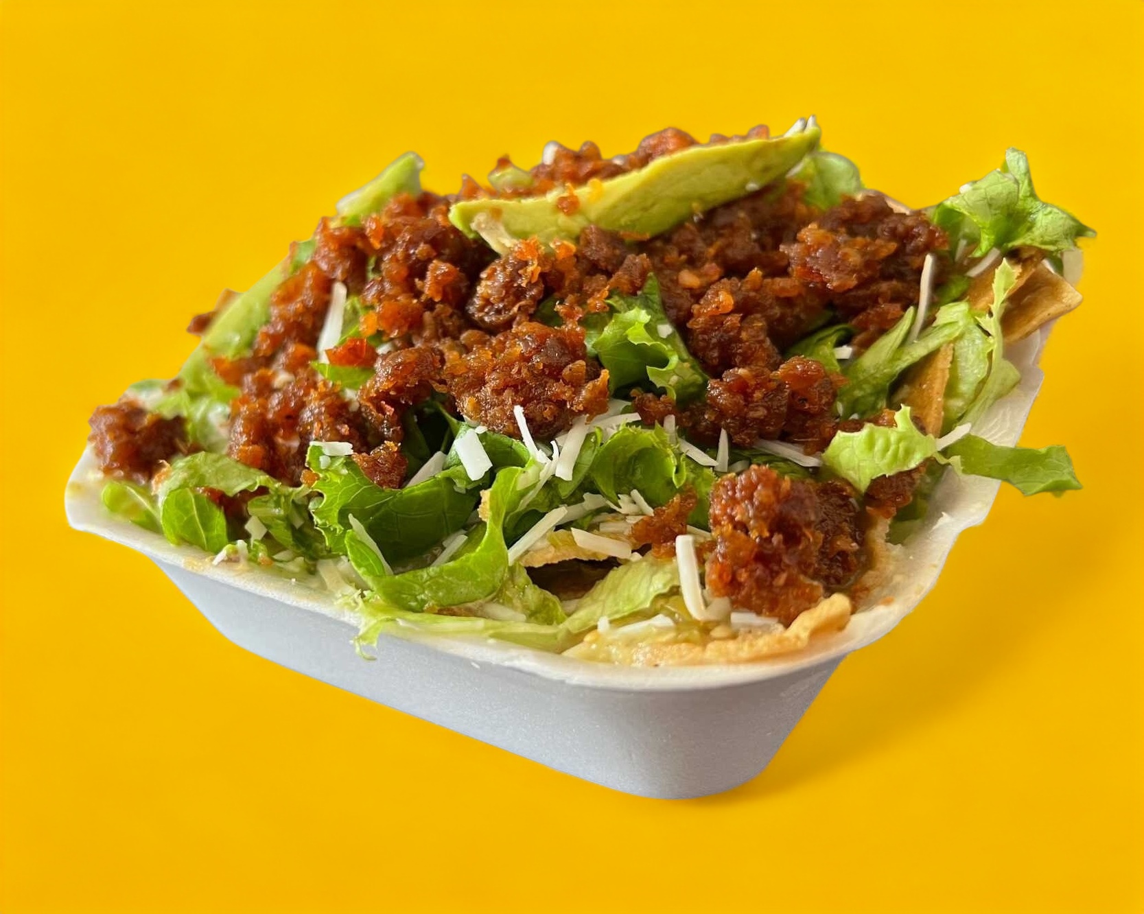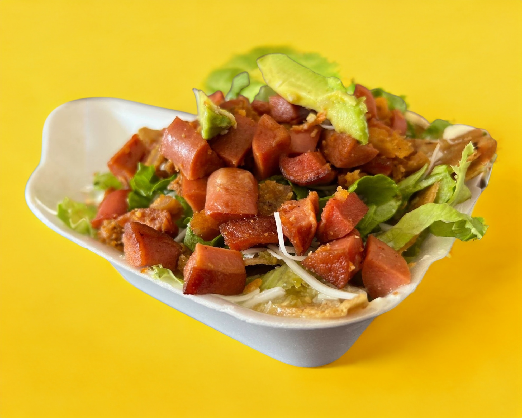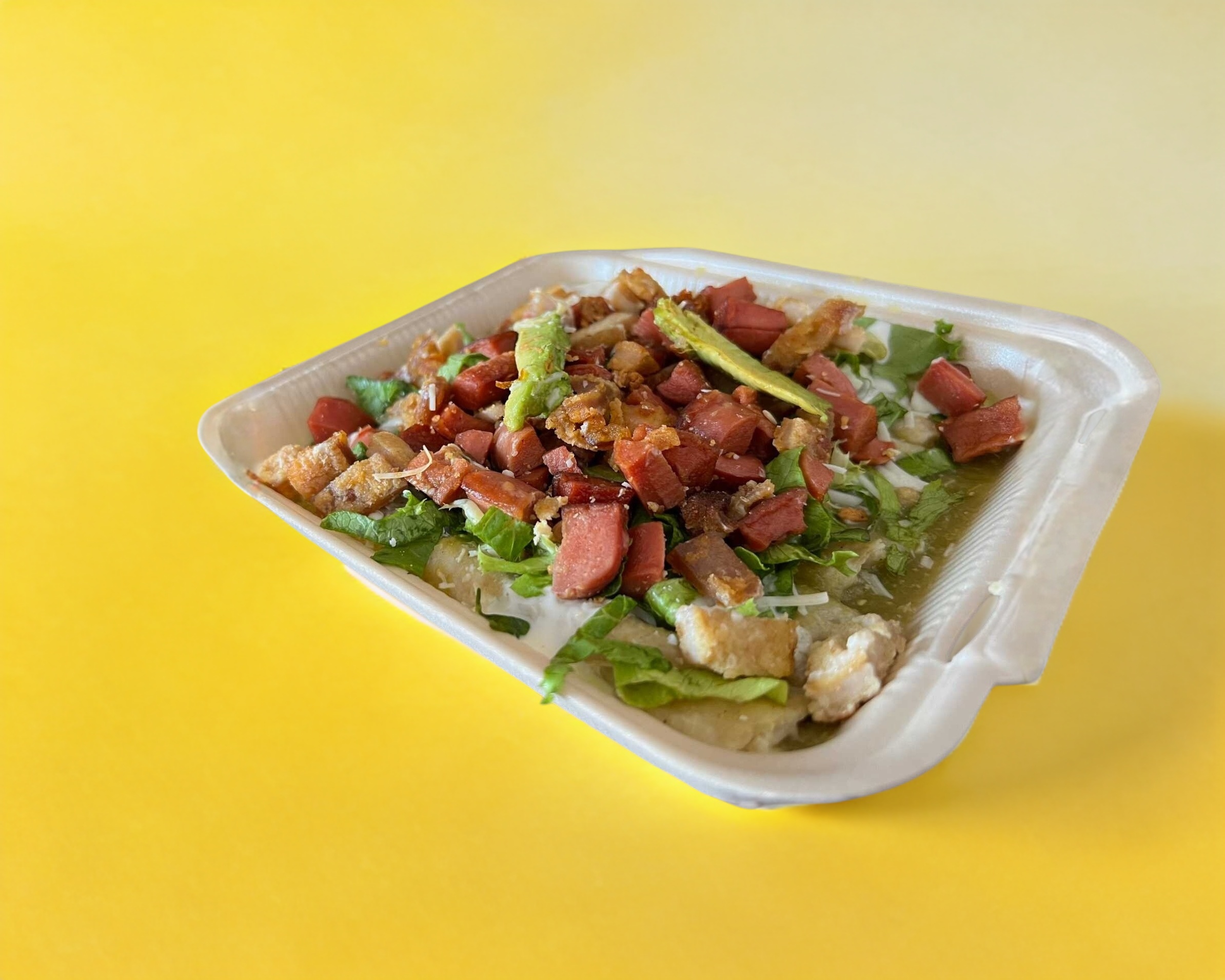 Totopos bañados en salsa verde con queso Oaxaca, queso molido, crema, lechuga, milanesa de cerdo, salchicha, chorizo rojo y aguacate.