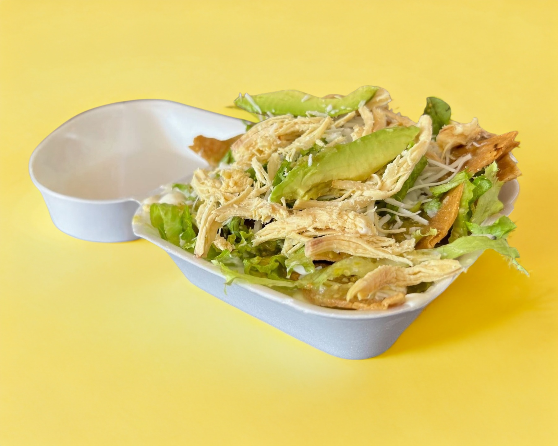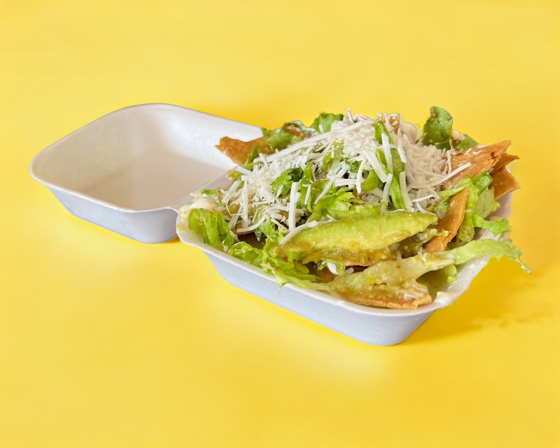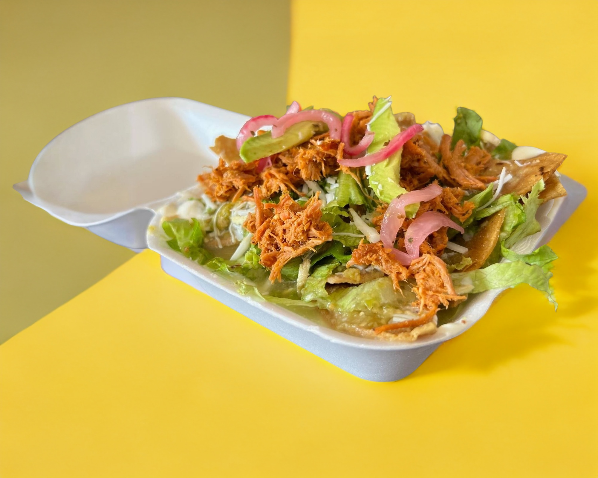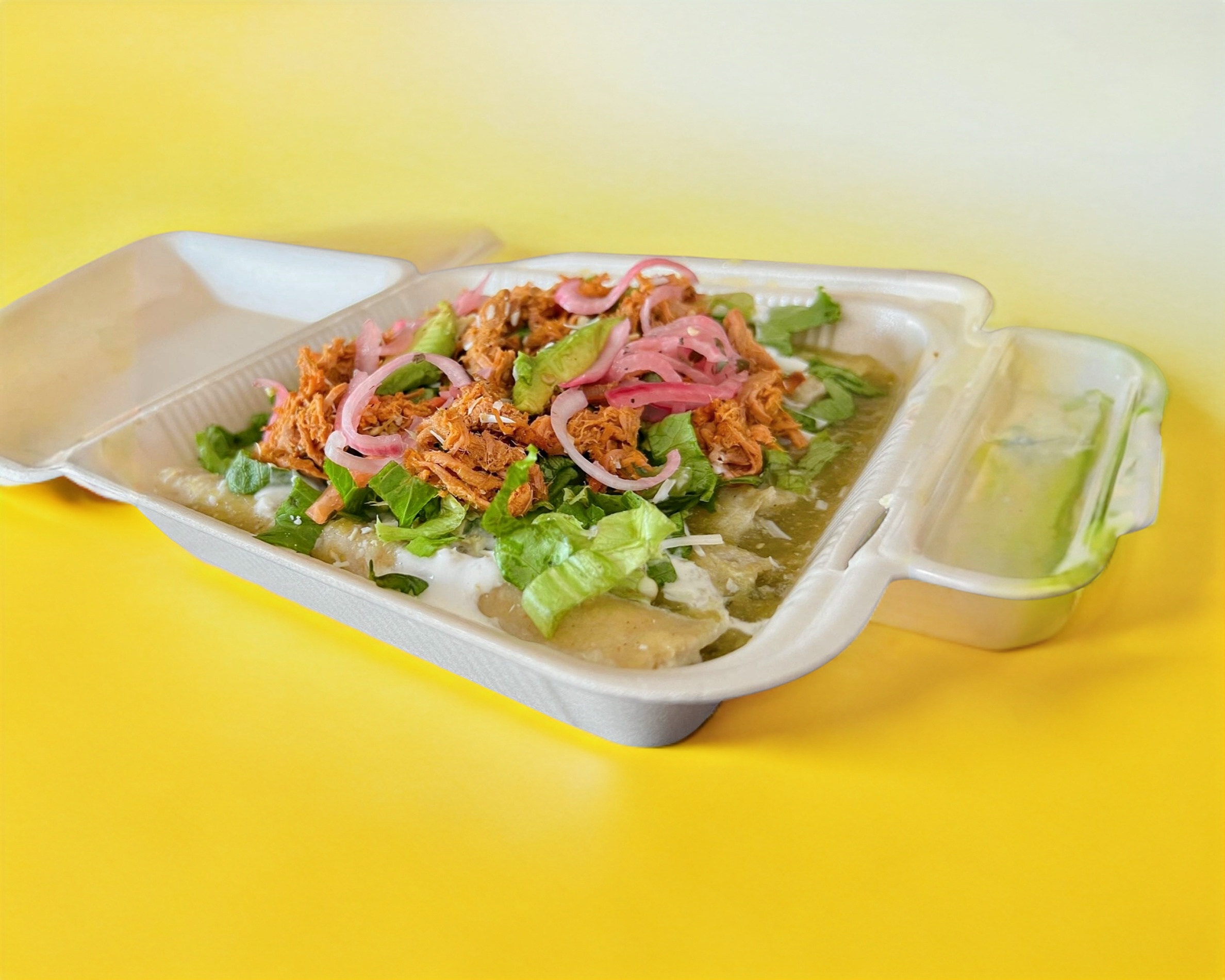 Totopos bañados en salsa verde con Queso Oaxaca, queso molido, crema, lechuga, pollo deshebrado y aguacate.