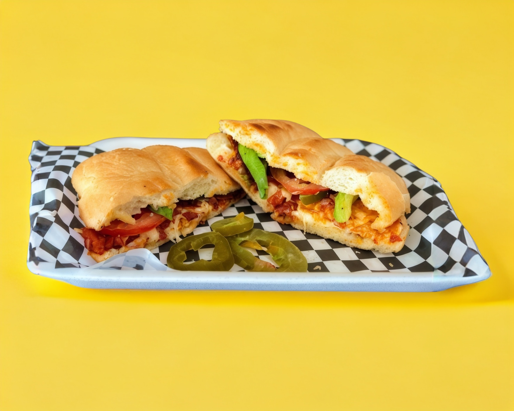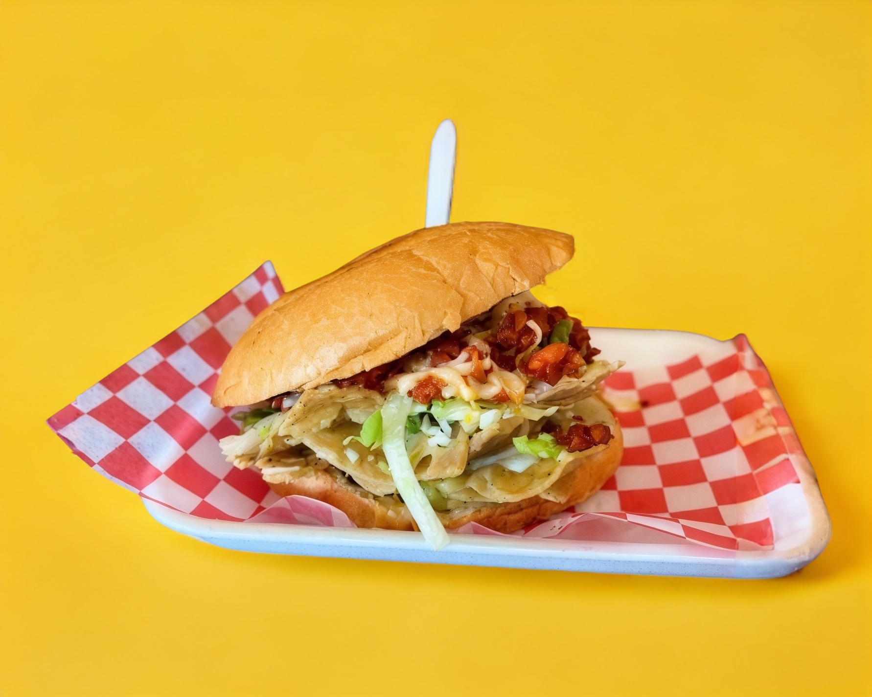 tres capas de pan integral, pollo deshebrado, queso oaxaca, queso amarillo, lechuga, verdura y picante