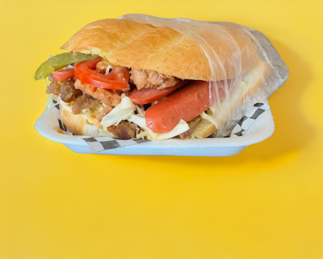 pan, milanesa de cerdo, chorizo rojo, aderezos, queso oaxaca, jitomate, aguacate y picante