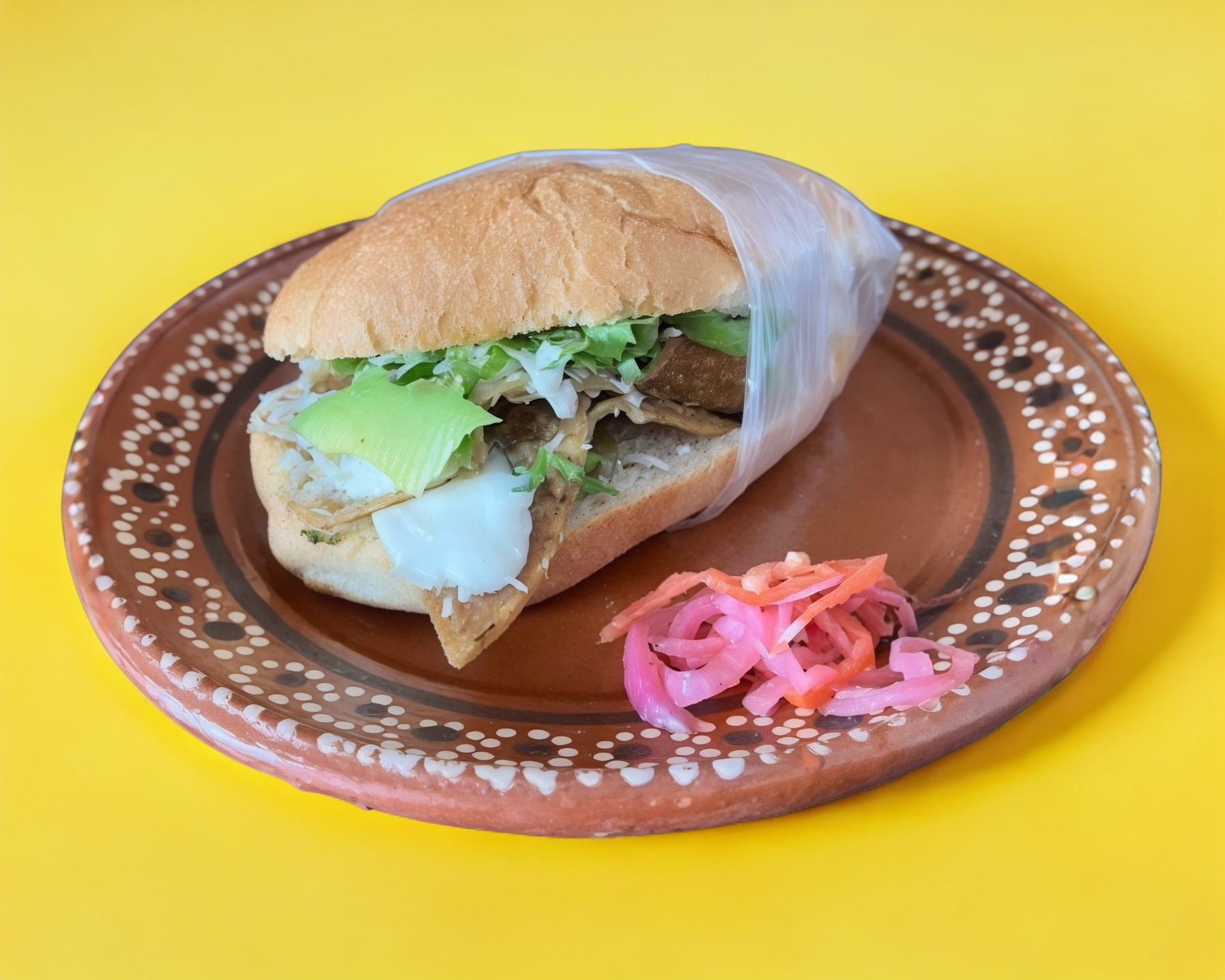 pan, cochinita pibil, aderezos, queso oaxaca, aguacate y picante