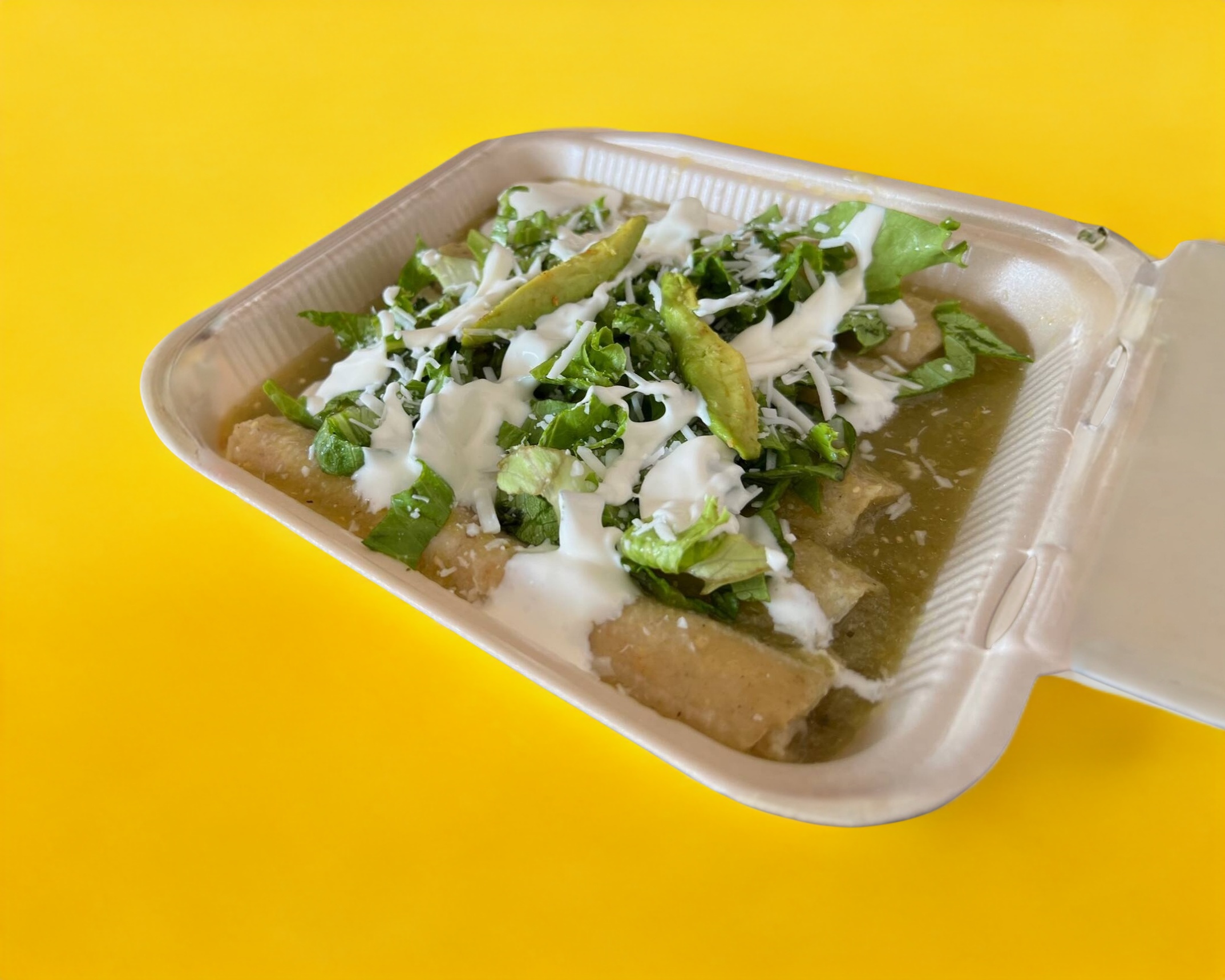 Cinco tortillas bañadas en salsa verde con queso oaxaca, queso molido, crema, lechuga y aguacate.
