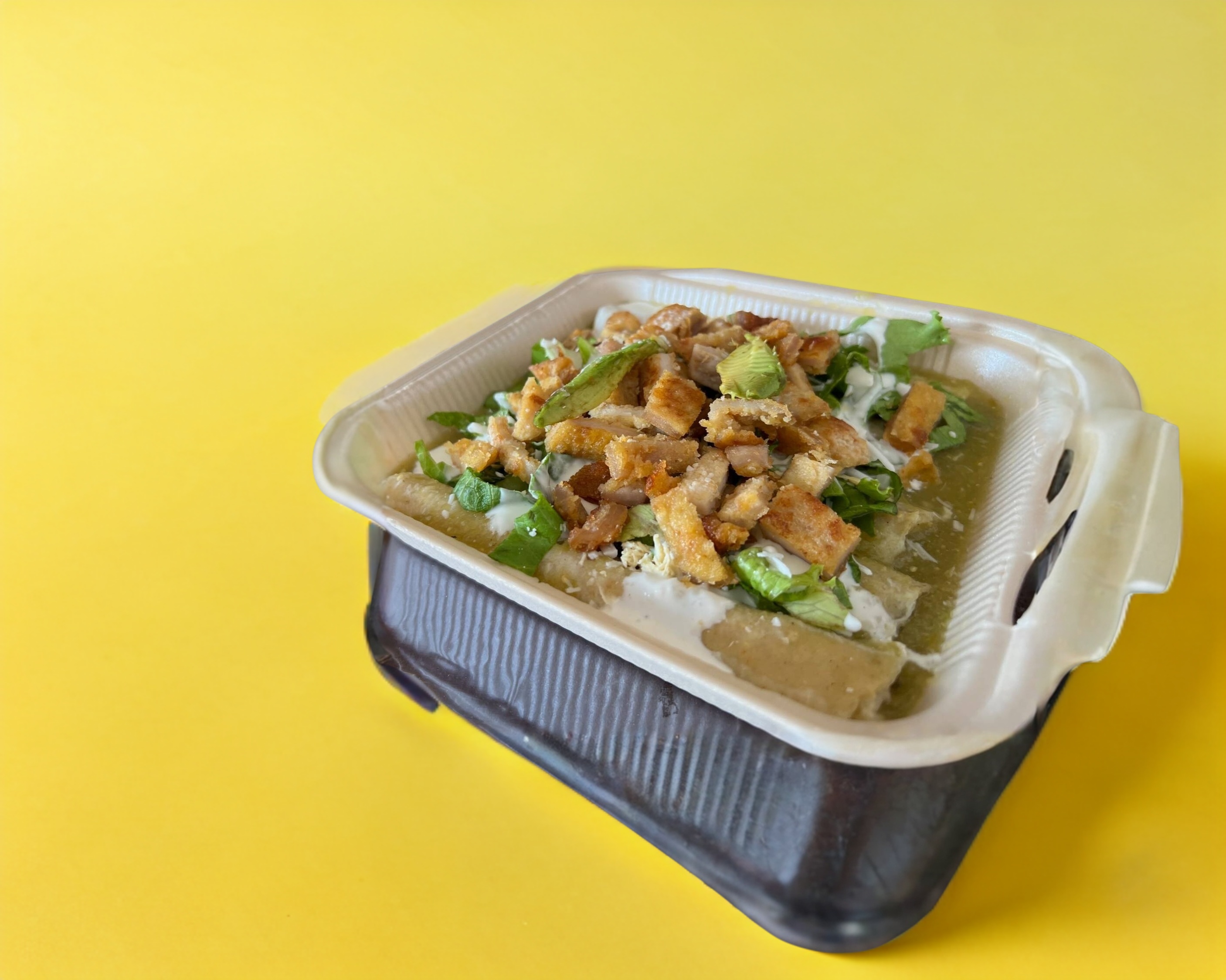 Cinco tortillas bañadas en salsa verde con queso oaxaca, queso molido, crema, lechuga, pollo deshebrado y aguacate.