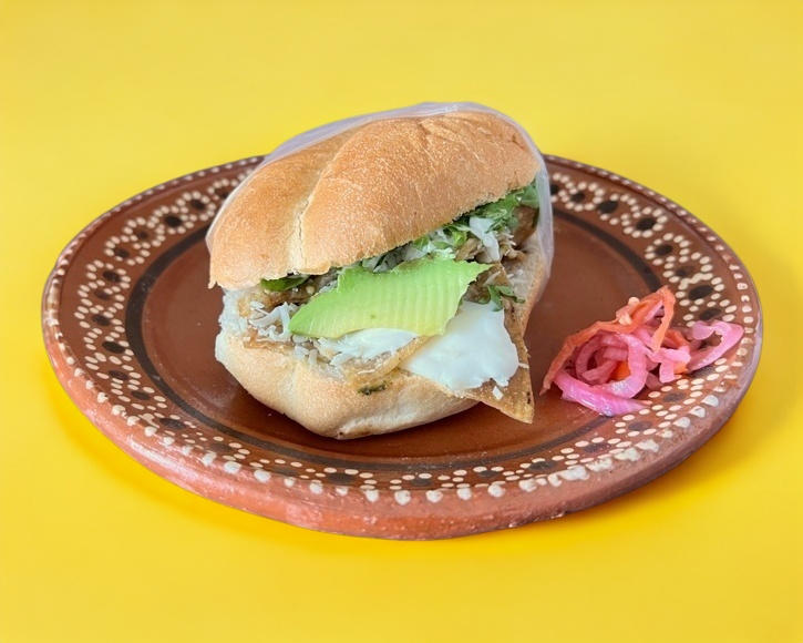 Telera con chilaquiles verdes, queso Oaxaca, queso molido, crema, lechuga, cochinita pibil y aguacate.