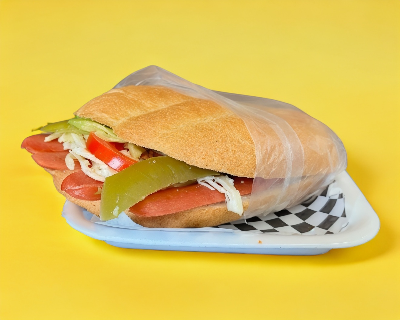 capas de pan integral, salchicha, queso oaxaca, queso amarillo, lechuga, verdura y picante