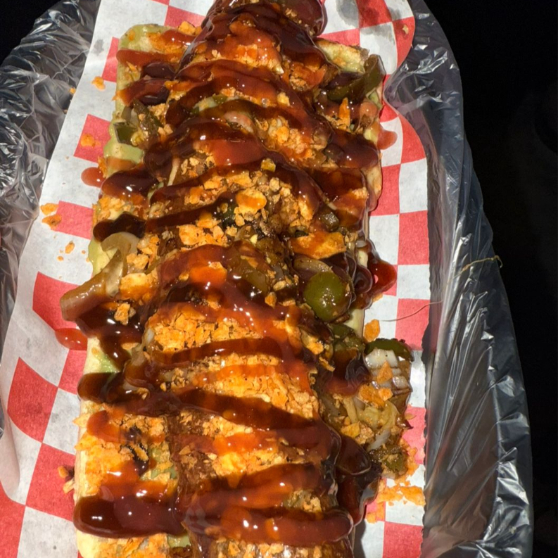 Lechuga, jtomate, cebolla, rajas, bbq, mayonesa, mostaza, catsup, jugusa y suave carne sonorense, con una preparacion unica