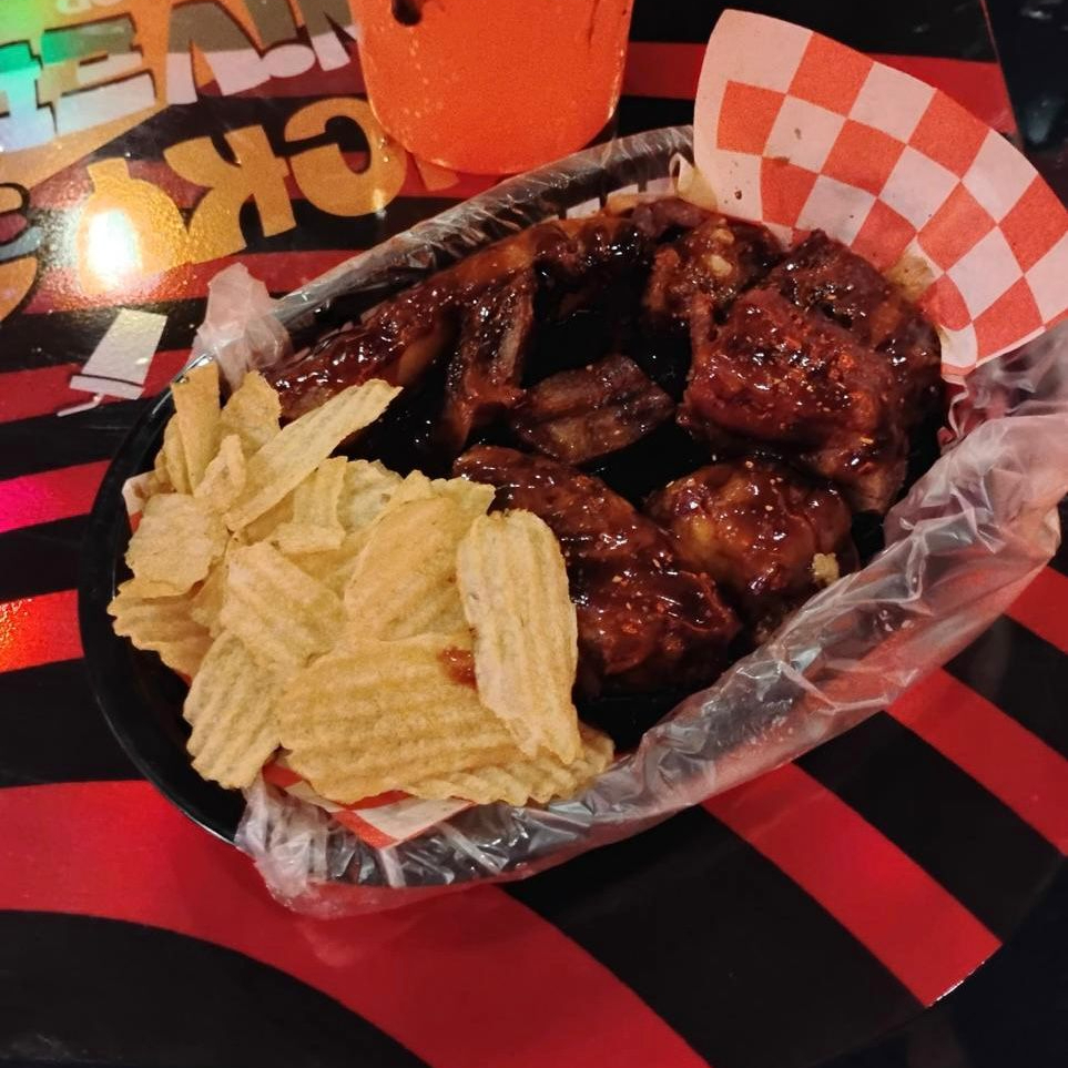 Alitas, costillas, tiras de pollo, ensalada, y papas de ojuela, todo listo para compartir.